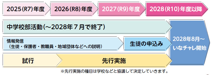 令和10年7月に平日・休日ともにすべての中学校部活動を終了し、子どもたちが地域の皆さんとともに活動する 「稲美町の地域クラブ活動」=「いなみチャレンジクラブ」を新たに開始します。