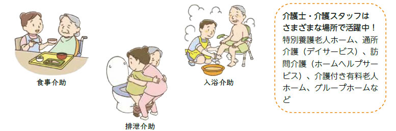 要介護者や要支援者に対し、日常生活を送るうえで必要な援助を提供する仕事です。食事や入浴、排泄、着替えなどをお手伝いします。