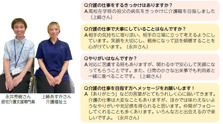 11月11日は「いい日、いい日」で介護の日。介護は、単に食事や入浴をお手伝いするだけでなく、利用者やその家族の安心と笑顔を支える大切な仕事です。今月は、介護職や町での取り組みについてさまざまな角度から紹介します!