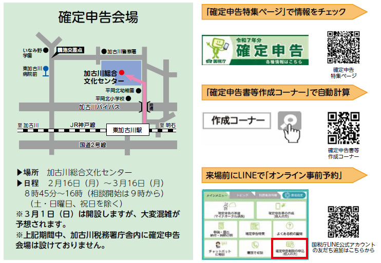 ※次の申告は、受け付けできませんのでe-Taxまたは加古川税務署の申告会場(加古川総合文化センター)で申告してください。
