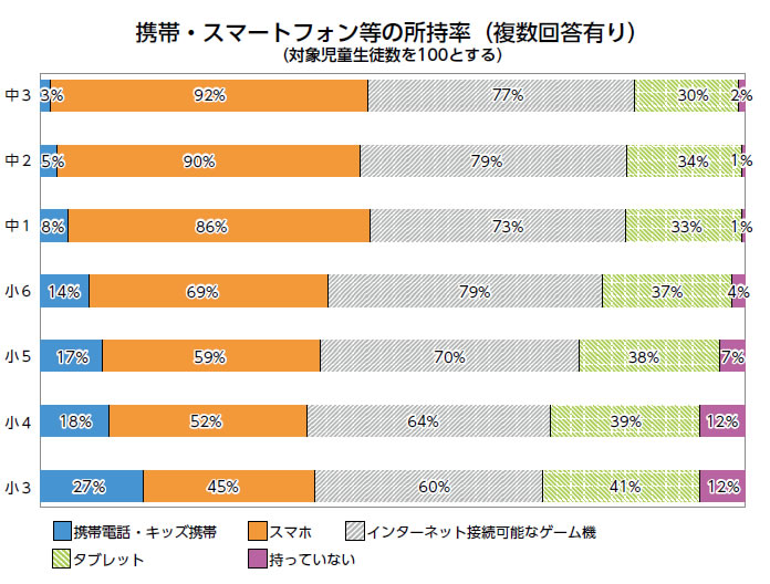 調査結果から、学年が上がるにつれて、スマホの所持率が高くなっており、小学6年生で69%(昨年より2%増加)であり、増加傾向にあります。ゲーム機(インターネット接続可能なもの)の所持率では、小学6年生は80%以上になり、以降、中学3年生まで同程度となっています。また、子ども同士のコミュニケーションにおいても、ネットが活用されて便利になる一方で、ネット依存や書き込みによるいじめ、ゲームによる高額な課金、個人情報の流出などのトラブルも多くなっています。