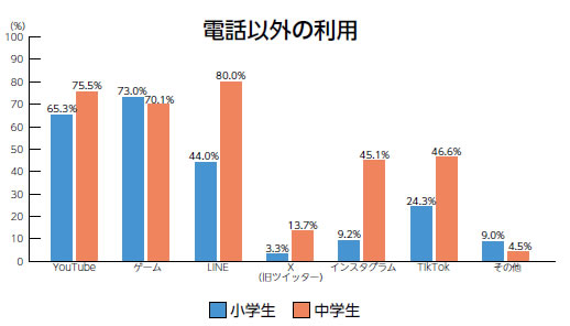 電話以外で利用しているコンテンツについては、下のグラフのようになっています。小・中学生ともにゲームやYouTubeの利用が多いことが分かります。ただ、中学生になると、LINEやインスタグラム、X(旧ツイッター)など、書き込みにより相手とやり取りの可能なコンテンツの利用が多くなっています。インスタグラムやXは、会ったことのない知らない人とでもやり取りが可能であり、注意も必要になってくると考えられます。