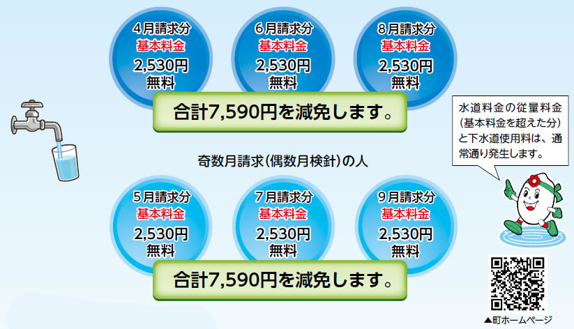 町では、物価高騰の影響を受けている皆さんの生活や経済活動を支援するため、水道の基本料金を4月請求分から3期分(6カ月)を無料にします。